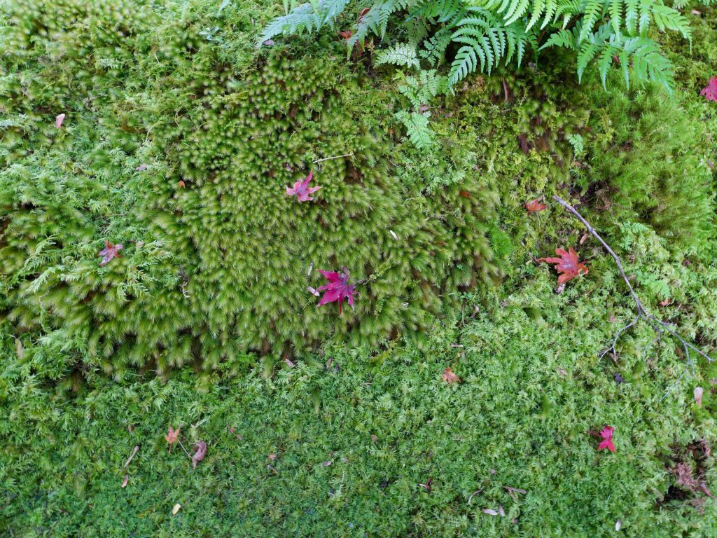 鮮やかな緑の苔に真っ赤な紅葉の葉が落ちていると言うシーンは見当たらず、落ちている紅葉の葉は茶色で縮れているものが多い様です。